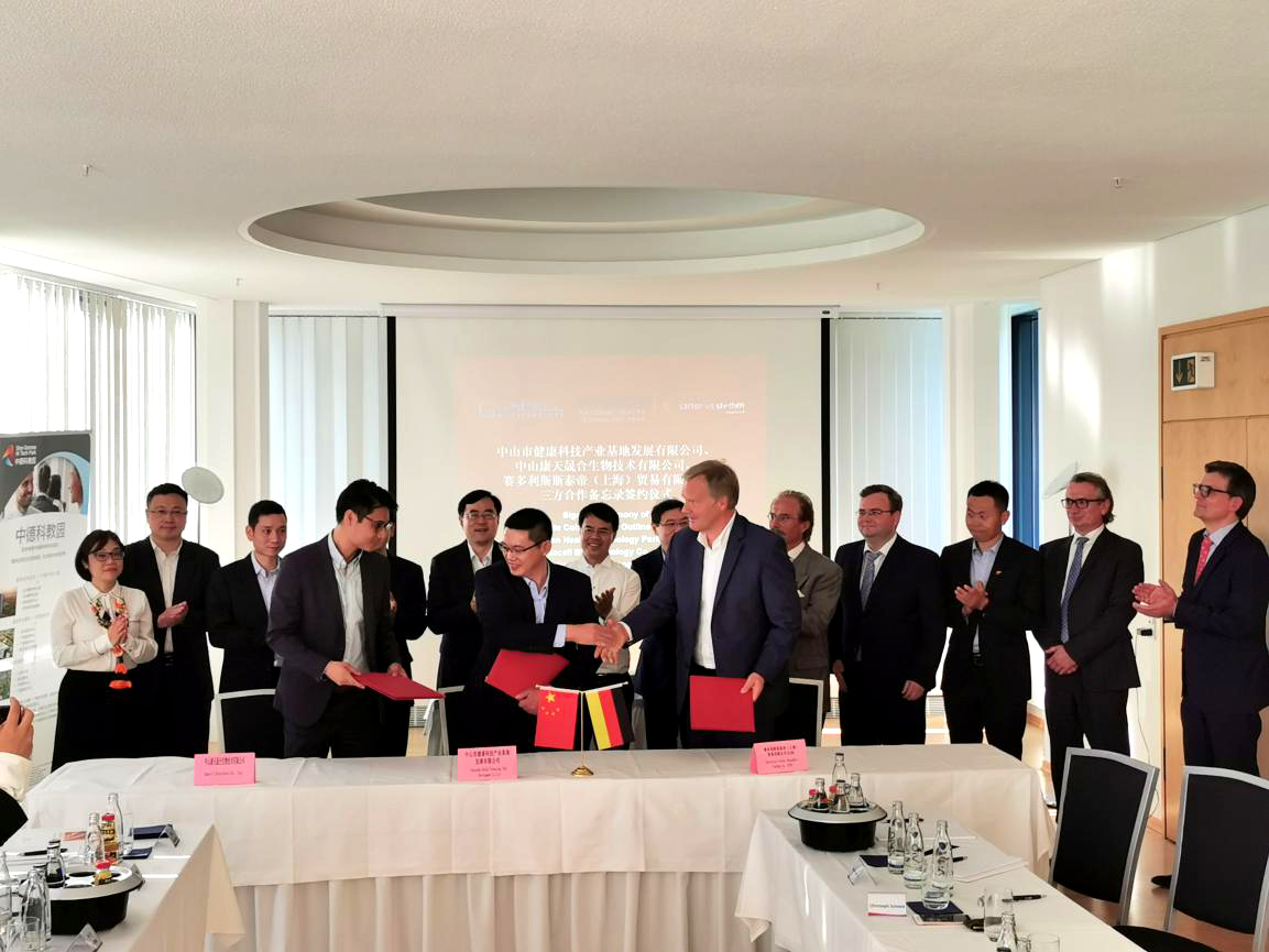為加快中德(中山)生物醫(yī)藥產(chǎn)業(yè)園發(fā)展,提升產(chǎn)業(yè)國際化發(fā)展水平,加強(qiáng)對歐洲招商引資工作,6月4日-12日,健康基地余從洪副總經(jīng)理率領(lǐng)招商團(tuán)隊(duì)隨中山市代表團(tuán)赴法國、德國、瑞士開展經(jīng)貿(mào)交流活動。期間,健康基地招商團(tuán)隊(duì)在法國參加了廣東省商務(wù)廳主辦的“粵港-法國經(jīng)貿(mào)合作交流會”活動;在德國出席了“中山遇見海德堡”企業(yè)座談會及項(xiàng)目簽約儀式,拜訪了歐洲分子生物實(shí)驗(yàn)室、默克集團(tuán);在瑞士洛桑參加了“中山中瑞醫(yī)療健康中國發(fā)展論壇”并與瑞士維生素研究所簽署了合作備忘錄,現(xiàn)場對接并考察了瑞士Abionic公司等生命科學(xué)企業(yè)和機(jī)構(gòu),取得了豐碩的成果。