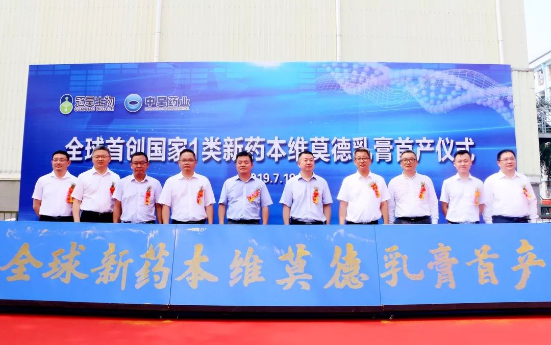 2019年7月19日上午,“全球首創(chuàng)國家1類新藥本維莫德乳膏首產(chǎn)”儀式在國家健康基地園區(qū)企業(yè)——廣東中昊藥業(yè)有限公司(以下簡稱“中昊藥業(yè)”)隆重舉行,這標(biāo)志著我國建國70年來第一個(gè)皮膚領(lǐng)域first-in-class的化學(xué)創(chuàng)新藥投產(chǎn)上市!