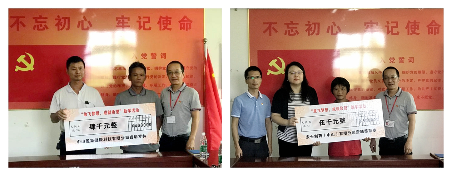 今年5月,健康基地黨委以“放飛希望,成就夢想”為主題,廣泛發(fā)動屬下兩新黨組織和愛心企業(yè)開展愛心助學。健康基地黨委下屬中山百靈生物技術有限公司黨支部響應號召,率先幫扶就讀于華南農業(yè)大學的貧困戶子女程梅桂,每年資助1萬元助學金,直至其完成學業(yè)。今年以來,健康基地黨委倡議發(fā)動園區(qū)9家企業(yè)完成第一期捐資共4.1萬元,結對資助團結村貧困學子12名。
