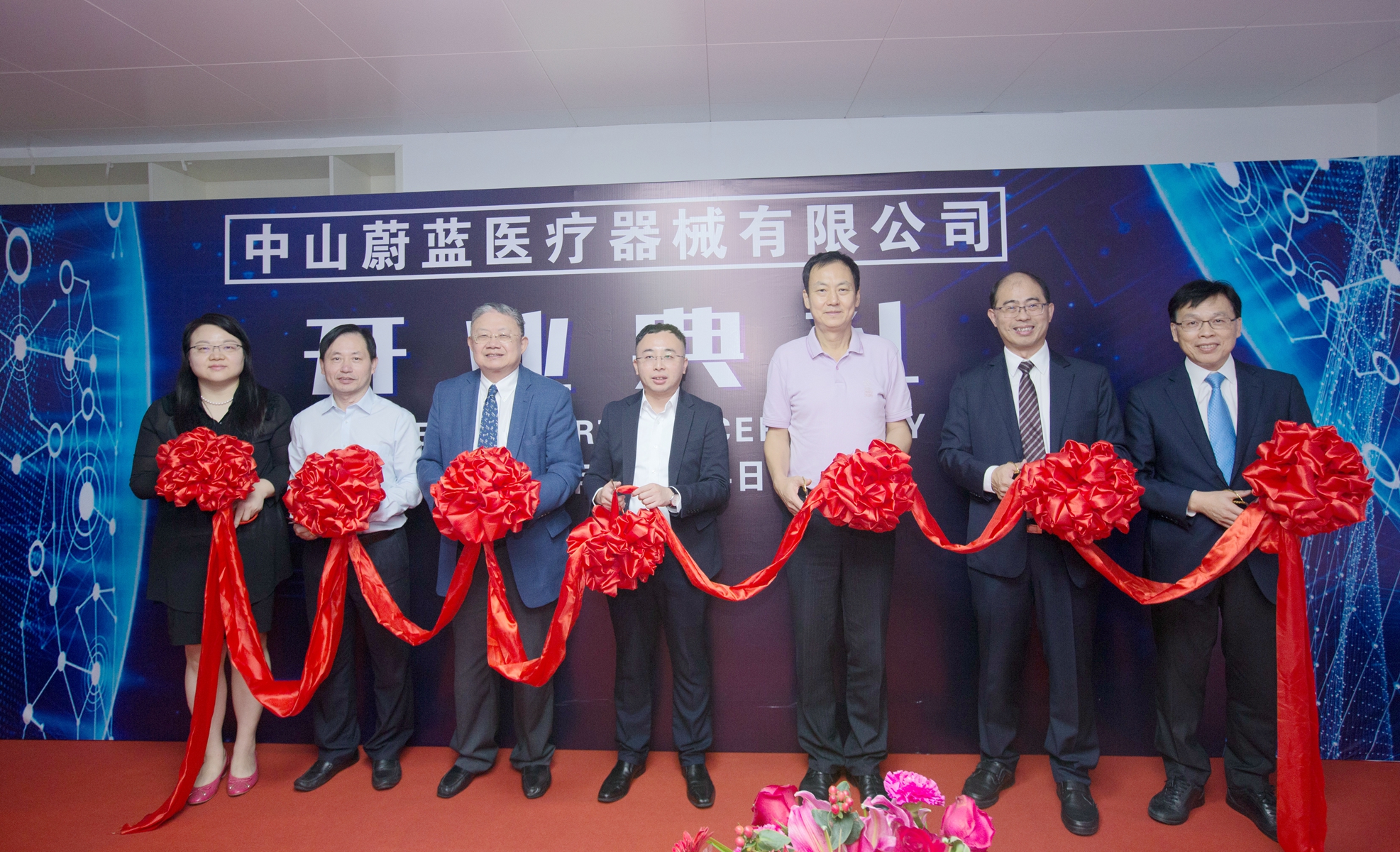 ▲蔚藍(lán)醫(yī)療開業(yè)剪彩 蔚藍(lán)醫(yī)療是今年中山3.28簽約項(xiàng)目,落戶健康基地僅半年時(shí)間,就完成了公司注冊(cè)、廠房裝修、團(tuán)隊(duì)搭建等前期籌備工作。項(xiàng)目由香港浸會(huì)大學(xué)黃嘉良教授帶領(lǐng)的內(nèi)部核心團(tuán)隊(duì)與世界著名的熒光和合成有機(jī)化學(xué)外部顧問團(tuán)隊(duì)組成,其“前列腺癌早期診斷試劑盒”系香港浸會(huì)大學(xué)首個(gè)在中山落戶的生物醫(yī)藥科技成果轉(zhuǎn)化項(xiàng)目。