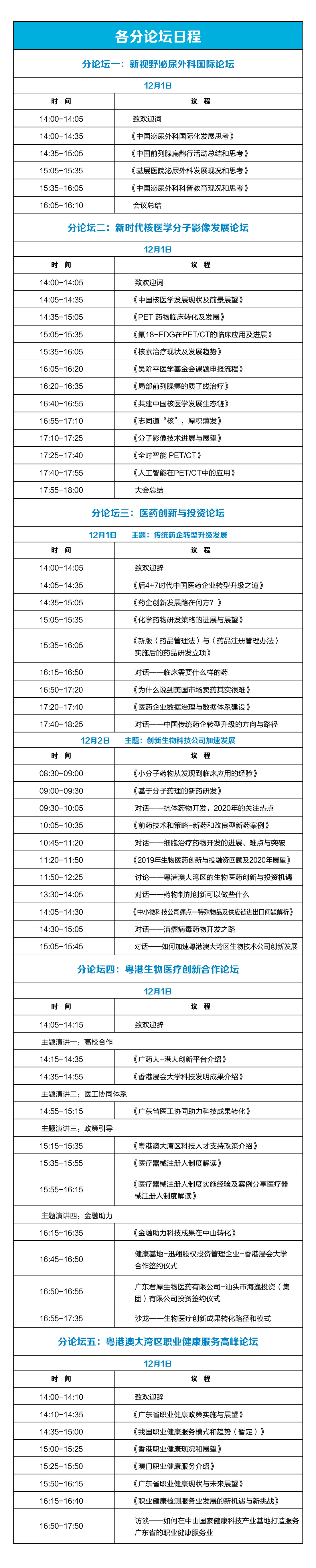 論壇開幕式和頒獎(jiǎng)大會(huì)后將舉行五個(gè)分論壇,其中有兩個(gè)分論壇是由吳階平醫(yī)學(xué)基金會(huì)主辦的醫(yī)學(xué)學(xué)術(shù)論壇,分別是新視野泌尿外科國(guó)際論壇和新時(shí)代核醫(yī)學(xué)分子影像發(fā)展論壇,將分別探討我國(guó)泌尿外科和核醫(yī)學(xué)的發(fā)展之路。另外三個(gè)分論壇均由中山方面舉辦,分別是醫(yī)藥創(chuàng)新與投資論壇、粵港生物醫(yī)療創(chuàng)新合作論壇,以及粵港澳大灣區(qū)職業(yè)健康服務(wù)高峰論壇。三個(gè)論壇與產(chǎn)業(yè)發(fā)展密切結(jié)合。醫(yī)藥創(chuàng)新與投資論壇匯聚醫(yī)藥界領(lǐng)軍人物,圍繞中國(guó)傳統(tǒng)藥企轉(zhuǎn)型升級(jí)和粵港澳大灣區(qū)的生物醫(yī)藥創(chuàng)新與投資機(jī)遇,探討資本市場(chǎng)助力,賦能傳統(tǒng)藥企,創(chuàng)新藥物研發(fā)與多元化資本金融結(jié)合的產(chǎn)業(yè)創(chuàng)新模式;粵港生物醫(yī)療創(chuàng)新合作論壇以醫(yī)療器械注冊(cè)人管理制度的具體實(shí)施、科技成果轉(zhuǎn)化范例等話題,聚焦香港高校科研成果、廣東醫(yī)工協(xié)同創(chuàng)新聯(lián)盟、金融科技助力等科技成果轉(zhuǎn)化中的關(guān)鍵要素資源展開討論,推動(dòng)在中山構(gòu)建“灣區(qū)技術(shù)+金融創(chuàng)新+中山落地產(chǎn)業(yè)化”模式;職業(yè)健康論壇重點(diǎn)就職業(yè)健康服務(wù)業(yè)的發(fā)展創(chuàng)新、促進(jìn)職業(yè)健康相關(guān)產(chǎn)業(yè)發(fā)展進(jìn)行深入研討,交流探索新時(shí)期職業(yè)健康服務(wù)業(yè)的實(shí)踐路徑和發(fā)展模式,助力健康灣區(qū)建設(shè)。