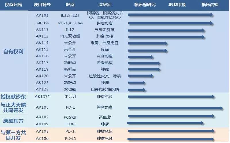 康方生物開發(fā)出中國(guó)最豐富、最多樣化的創(chuàng)新抗體藥物在研管線之一,涉及20 多個(gè)藥物開發(fā)項(xiàng)目,其中10個(gè)抗體處于臨床階段,六個(gè)雙特異性抗體(兩個(gè)處于臨床階段)及四個(gè)抗體獲得FDA的IND批準(zhǔn)。