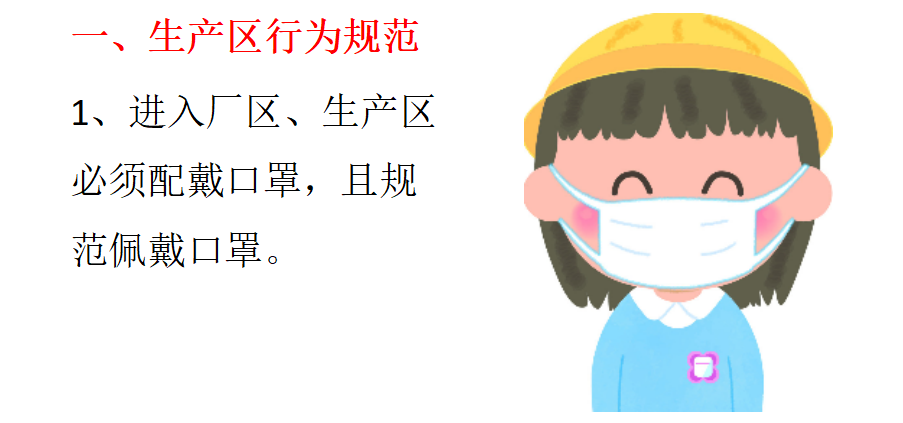 據(jù)公司生產(chǎn)技術(shù)部負(fù)責(zé)人羅麗敏介紹,這份疫情防控行為規(guī)范分為生產(chǎn)區(qū)行為規(guī)范、生產(chǎn)區(qū)清潔規(guī)范、就餐行為規(guī)范、生活區(qū)注意事項(xiàng)、洗手及佩戴口罩方法六大防疫防控重點(diǎn),每一項(xiàng)均有具體的操作細(xì)則,及示意圖。