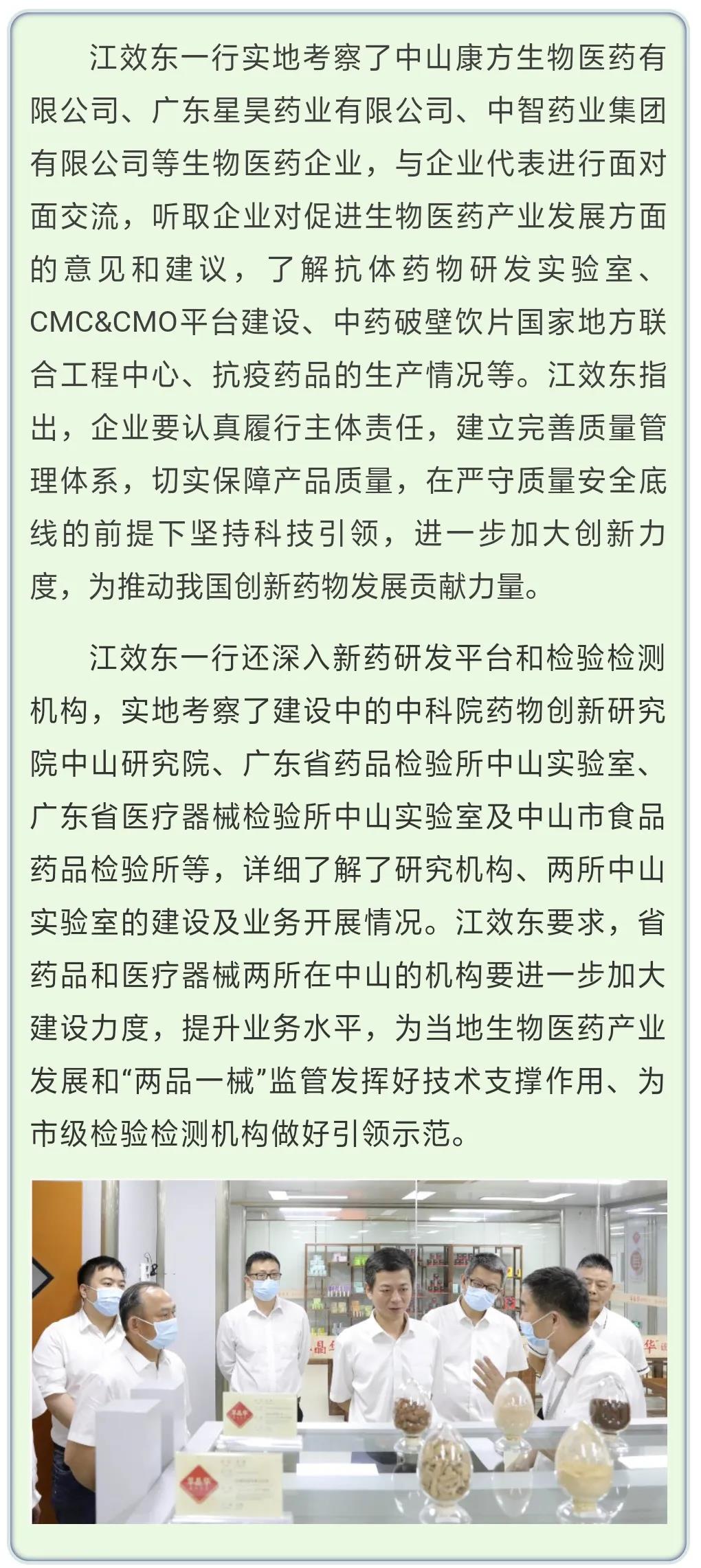 5月25日,廣東省藥品監(jiān)督管理局黨組書記、局長江效東一行赴中山市就生物醫(yī)藥產(chǎn)業(yè)發(fā)展與藥品安全監(jiān)管工作開展調研,實地考察了健康基地園區(qū)生物醫(yī)藥企業(yè)及研究和檢驗檢測機構。中山市市委書記賴澤華、市長危偉漢、副市長雷岳龍參加了座談交流。