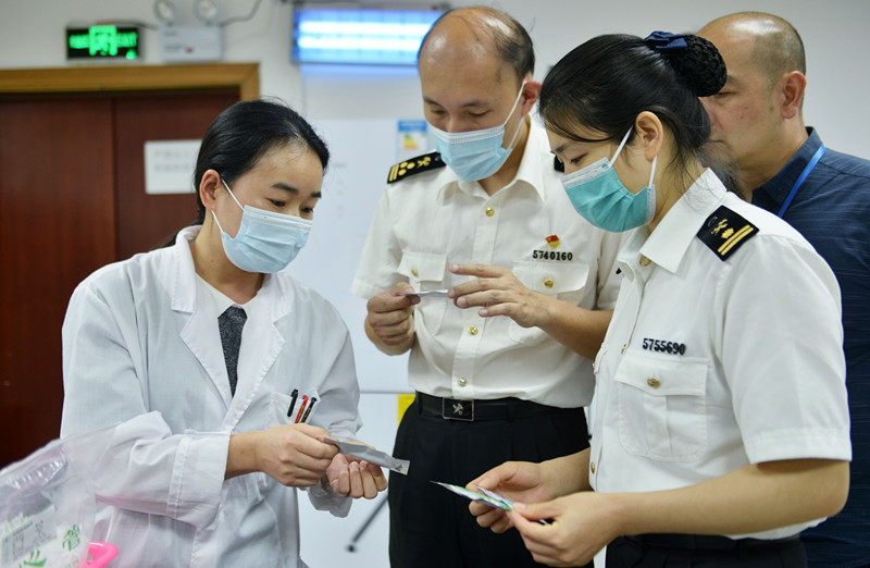 ▲海關人員在創(chuàng)藝生化檢查新冠病毒抗體檢測卡生產(chǎn)情況