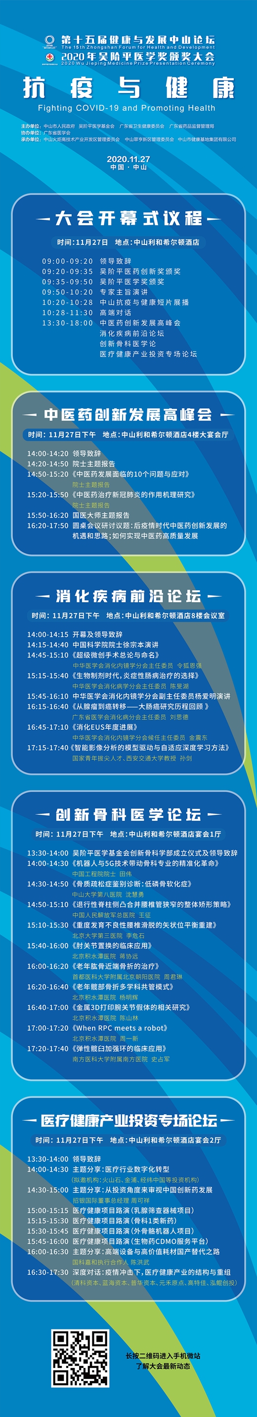 11月27日,第十五屆健康與發(fā)展中山論壇、2020年吳階平醫(yī)學(xué)獎(jiǎng)?lì)C獎(jiǎng)大會(huì)將在中山市隆重召開(kāi)。