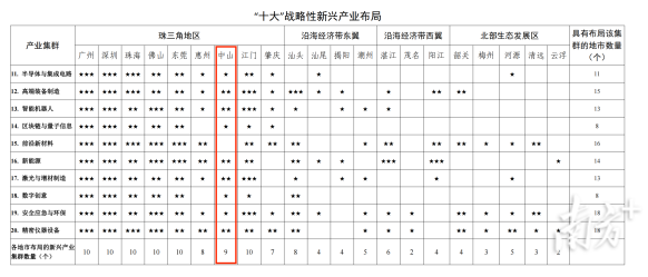 《規(guī)劃》中,共有68處內(nèi)容直接提及中山。在“十大”戰(zhàn)略性支柱產(chǎn)業(yè)布局和“十大”戰(zhàn)略性新興產(chǎn)業(yè)布局中,有19個(gè)產(chǎn)業(yè)將中山作為布局城市。其中,現(xiàn)代輕工紡織、生物醫(yī)藥與健康、現(xiàn)代農(nóng)業(yè)與食品3個(gè)產(chǎn)業(yè)將中山列為核心布局城市。