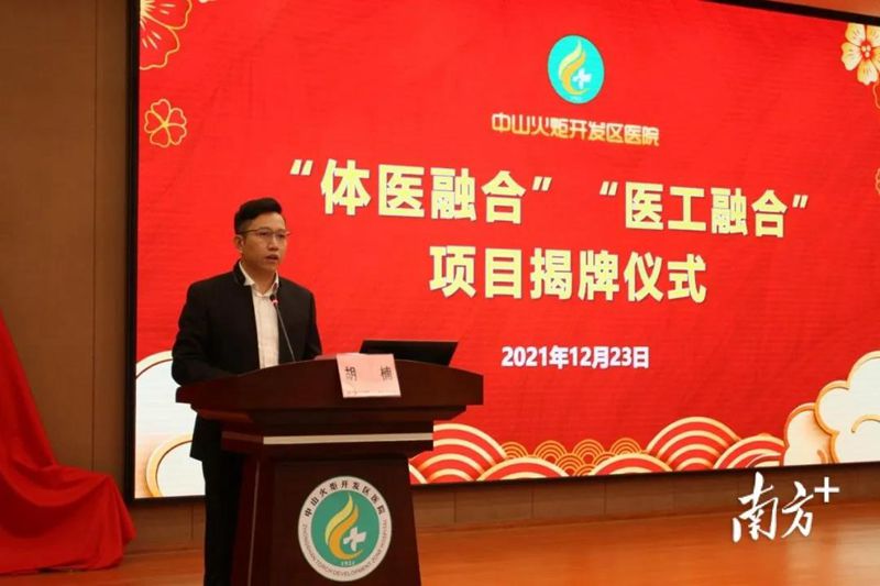 火炬開發(fā)區(qū)醫(yī)院黨委副書記陳華介紹了“體醫(yī)融合”及“醫(yī)工融合”項目的合作背景。他表示,兩個項目,都是醫(yī)院跨界創(chuàng)新的探索,都是造福群眾的健康項目。首先,體醫(yī)融合響應(yīng)國家健康中國戰(zhàn)略,中山市體育競賽與國民體質(zhì)監(jiān)測中心和中山火炬開發(fā)區(qū)醫(yī)院將積極開展關(guān)于體醫(yī)合作模式的交流和探討,發(fā)揮各自在健康促進、慢性病預(yù)防和傷病康復(fù)等方面的專業(yè)優(yōu)勢,強強聯(lián)合,共建“中山市體質(zhì)測定與運動健身指導(dǎo)站”和“體醫(yī)融合”運動康復(fù)基地。其次,醫(yī)工融合是貫徹“健康中國”國家戰(zhàn)略的切實行動,也是火炬開發(fā)區(qū)醫(yī)院創(chuàng)三甲的現(xiàn)實需要,醫(yī)院在重點學(xué)科建設(shè)上已有新突破,需要更多科研成果及轉(zhuǎn)化,同區(qū)域的國家健康科技產(chǎn)業(yè)基地?fù)碛袔装偌疑镝t(yī)藥企業(yè),整合“醫(yī)”+“工”資源,利用“醫(yī)”+“工”優(yōu)勢,增加科研項目合作、加速科研成果轉(zhuǎn)化,是實現(xiàn)醫(yī)工協(xié)同、共謀醫(yī)學(xué)科研與產(chǎn)業(yè)共同發(fā)展的路徑。