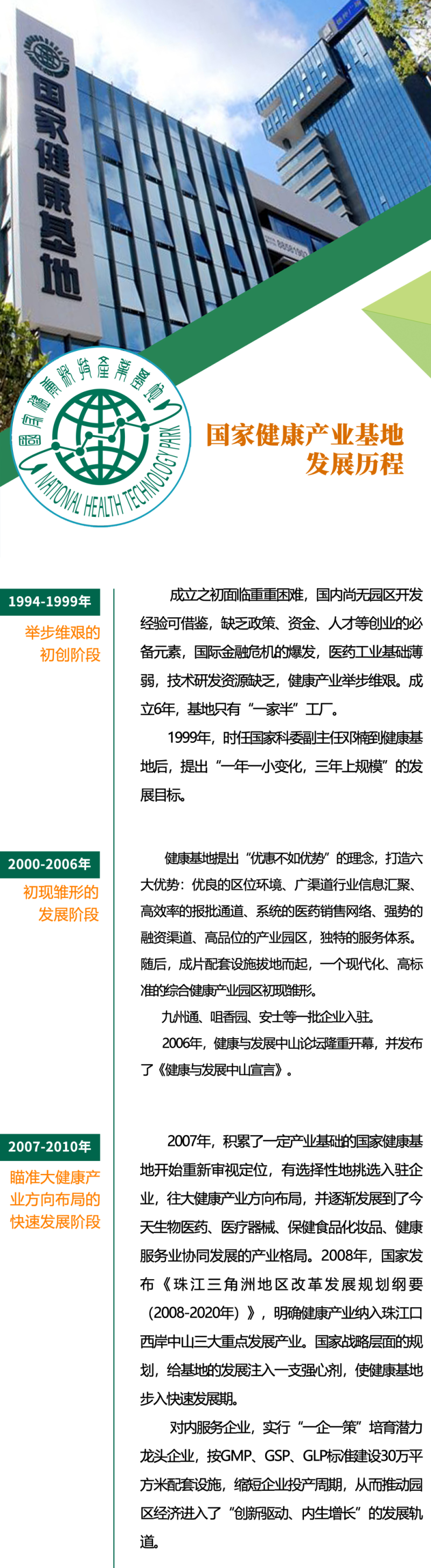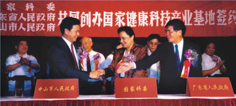 1992年1月,中美兩國(guó)在華盛頓聯(lián)合簽署了《關(guān)于知識(shí)產(chǎn)權(quán)保護(hù)的諒解備忘錄》。國(guó)際環(huán)境的變化,要求中國(guó)必須擁有具有自主知識(shí)產(chǎn)權(quán)的創(chuàng)新藥物,否則必將在未來(lái)的經(jīng)濟(jì)角力中吃虧。而這也同時(shí)意味著,在中國(guó)建設(shè)一個(gè)按照國(guó)際創(chuàng)新藥物標(biāo)準(zhǔn)的新藥研究、開發(fā)和生產(chǎn)基地,顯得迫切而重要。有山有水有碼頭、離港澳近的中山贏得了這次機(jī)會(huì)。1994年,時(shí)任國(guó)家科技部副部長(zhǎng)鄧楠、廣東省副省長(zhǎng)盧鐘鶴、中山市市長(zhǎng)湯炳權(quán)分別代表國(guó)家科委、廣東省人民政府和中山市人民政府,在中山正式簽署協(xié)議,由三方共建當(dāng)時(shí)國(guó)內(nèi)唯一的國(guó)家級(jí)健康科技產(chǎn)業(yè)基地,這標(biāo)志著中國(guó)的自主新藥研發(fā)和產(chǎn)業(yè)化從此在健康基地邁入征途。
