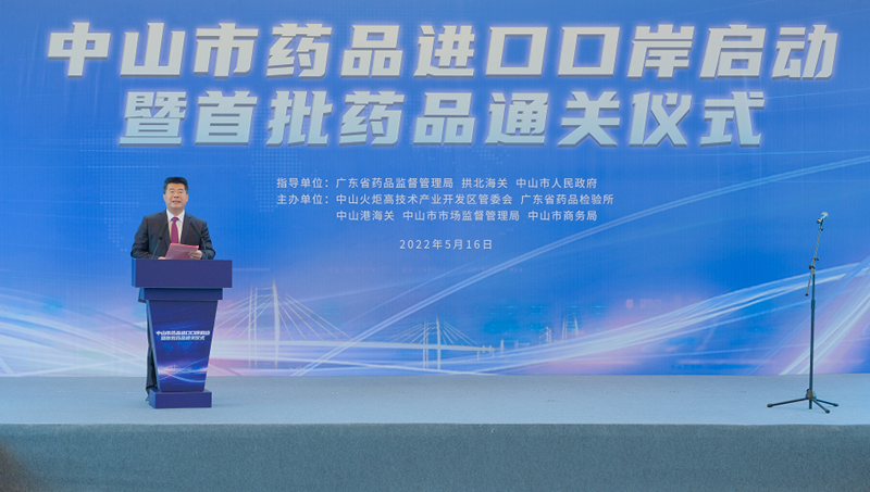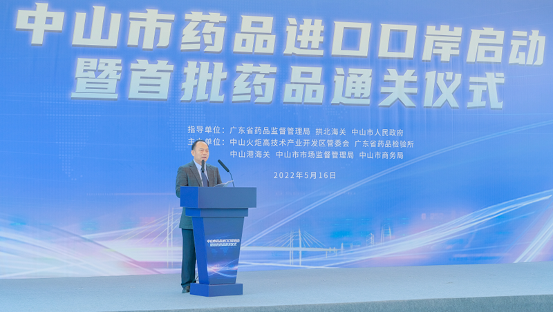 省藥品監(jiān)督管理局一級(jí)巡視員蘇盛鋒,省藥品監(jiān)督管理局二級(jí)巡視員羅卓雅,拱北海關(guān)黨委委員、副關(guān)長(zhǎng)何宏愷,市委副書記、火炬開發(fā)區(qū)黨工委書記陳文鋒,副市長(zhǎng)歐陽錦全等領(lǐng)導(dǎo)出席中山市藥品進(jìn)口口岸啟動(dòng)暨首批藥品進(jìn)口通關(guān)啟動(dòng)儀式。