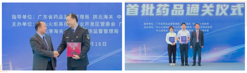 啟動(dòng)儀式上,蘇盛鋒為中山市市場(chǎng)監(jiān)督管理局頒發(fā)藥品進(jìn)口備案業(yè)務(wù)公章及密鑰;歐陽錦全為首批藥品進(jìn)口企業(yè)廣東金城金素制藥有限公司(廣東欖都藥業(yè))頒發(fā)《進(jìn)口藥品通關(guān)單》、為香港保和堂制藥有限公司頒發(fā)《進(jìn)口藥品通關(guān)單》和《進(jìn)口藥品檢驗(yàn)通知書》。