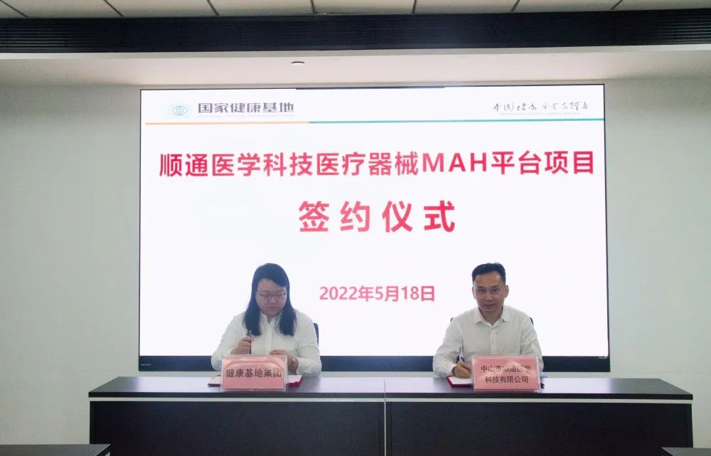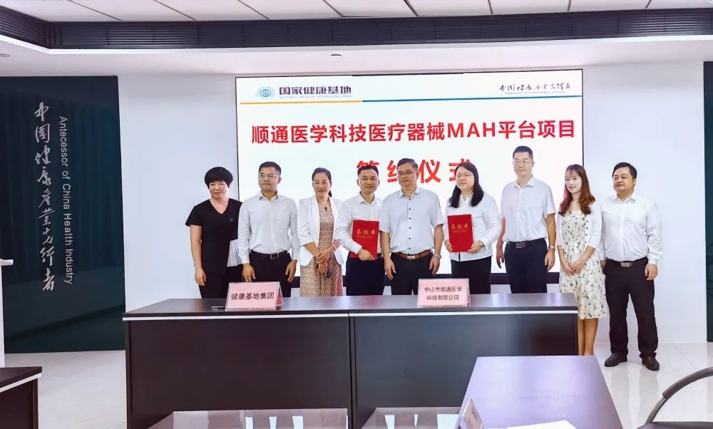 5月18日,中山市順通醫(yī)學(xué)科技有限公司醫(yī)療器械MAH持證平臺項目簽約落戶健康基地。中山港街道黨工委副書記徐世平、健康基地總經(jīng)理萬鶴群、中山市順通醫(yī)學(xué)科技有限公司(下稱“順通醫(yī)學(xué)公司”)總經(jīng)理云惟鈺等出席簽約儀式。