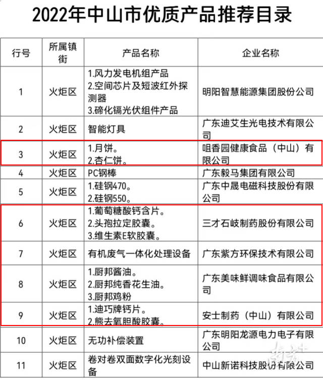 本次上榜的企業(yè)基本涵蓋了中山市內(nèi)主要知名企業(yè)及其“拳頭”產(chǎn)品。如在食品類方面,包括咀香園健康食品(中山)有限公司的杏仁餅、廣東美味鮮調(diào)味食品有限公司廚邦醬油等。健康醫(yī)藥領(lǐng)域,包括安士制藥(中山)有限公司的迪巧牌鈣片、三才石岐制藥股份有限公司的葡萄糖酸鈣含片;工業(yè)產(chǎn)品領(lǐng)域,包括廣東紫方環(huán)保技術(shù)有限公司有機(jī)廢氣一體化處理設(shè)備等。
