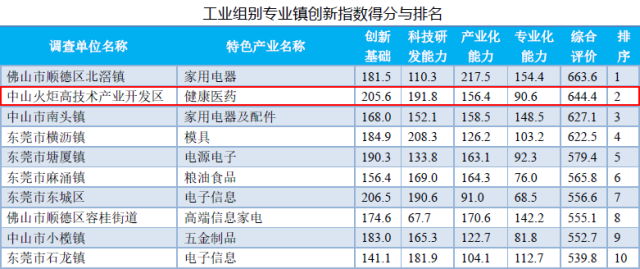 在參與評(píng)比的廣東省工業(yè)類別253個(gè)專業(yè)鎮(zhèn)中,針對(duì)有效樣本的各項(xiàng)創(chuàng)新指標(biāo),計(jì)算得出創(chuàng)新指數(shù)排位前100位次的專業(yè)鎮(zhèn)指數(shù),佛山順德區(qū)北滘鎮(zhèn)(家用電器組團(tuán))創(chuàng)新指數(shù)得分最高,達(dá)663.6分,中山火炬高新技術(shù)產(chǎn)業(yè)開發(fā)區(qū)(健康醫(yī)藥組團(tuán))以644.4分奪得第二名,中山火炬區(qū)健康醫(yī)藥產(chǎn)業(yè)專業(yè)鎮(zhèn)創(chuàng)新基礎(chǔ)(205.6分)和科技研發(fā)能力(191.8分),分別位列全省第3、第2位。