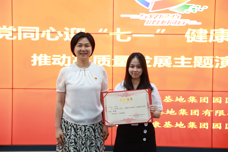 健康基地集團(tuán)園區(qū)黨委書記、總經(jīng)理萬鶴群為優(yōu)秀獎(jiǎng)獲得者劉婉思(投資部)、郭培鑫(工程部)、楊卓星(經(jīng)濟(jì)發(fā)展部)、劉賢進(jìn)(招商二部)頒獎(jiǎng)