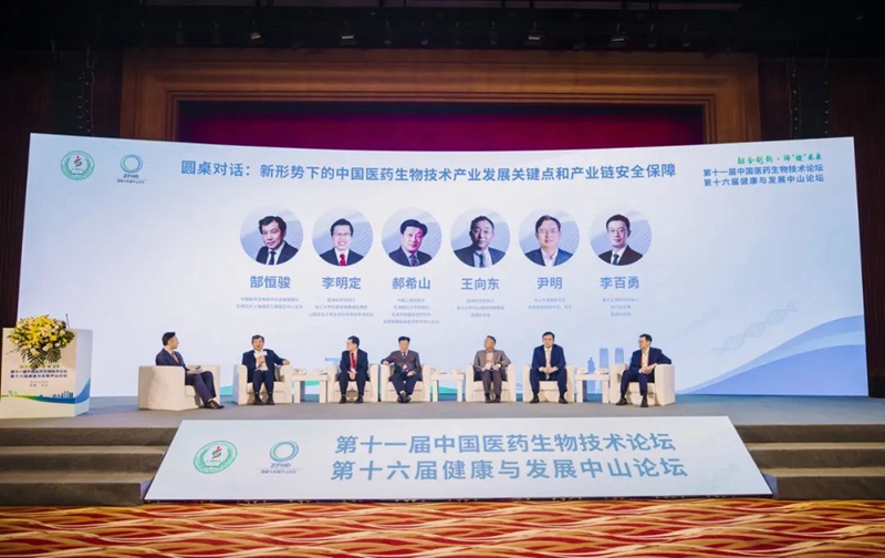 在圓桌對(duì)話環(huán)節(jié),中國工程院院士、天津醫(yī)科大學(xué)原校長、天津市腫瘤研究所所長、國家腫瘤臨床醫(yī)學(xué)研究中心主任郝希山,歐洲科學(xué)院院士、復(fù)旦大學(xué)中山醫(yī)院特聘教授、首席科學(xué)家王向東,歐洲科學(xué)院外籍院士、浙江大學(xué)求是講席教授及博導(dǎo)、山西農(nóng)業(yè)大學(xué)生命科學(xué)學(xué)院學(xué)術(shù)院長李明定,中山市委副秘書長、發(fā)改局局長尹明,中國醫(yī)藥生物技術(shù)協(xié)會(huì)副理事長、生物芯片上海國家工程研究中心主任郜恒駿,康方生物聯(lián)合創(chuàng)始人、執(zhí)行副總裁、首席科學(xué)官李百勇等行業(yè)專家和企業(yè)家齊聚一堂,圍繞“新形勢下中國醫(yī)藥生物技術(shù)產(chǎn)業(yè)發(fā)展關(guān)鍵點(diǎn)和產(chǎn)業(yè)鏈安全保障”主題進(jìn)行了探討,并就“ ‘黃金內(nèi)灣’健康產(chǎn)業(yè)發(fā)展新機(jī)遇”等議題分享了精彩的觀點(diǎn)與思考。