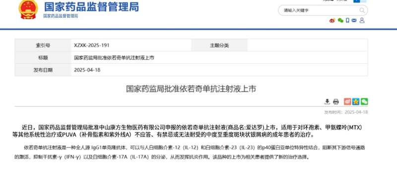4月18日,健康基地園區(qū)企業(yè)康方生物(9926.HK)欣然宣布,企業(yè)獨立自主研發(fā)的愛達羅®(依若奇單抗,IL-12/IL-23“雙靶向”單克隆抗體)獲得國家藥品監(jiān)督管理局(NMPA)批準(zhǔn)上市,適用于中重度斑塊狀銀屑病成人患者的治療。