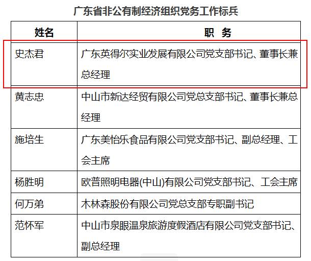 6月27日,廣東省非公有制經(jīng)濟(jì)組織黨建工作座談會在廣州召開,總結(jié)全省非公經(jīng)濟(jì)組織黨建工作,選樹一批先進(jìn)單位和個人。其中,中山市共有6個非公企業(yè)黨組織獲獎,12名先進(jìn)個人獲獎。在這其中,健康基地園區(qū)企業(yè)康方生物醫(yī)藥有限公司黨支部書記楊芳和廣東英得爾實業(yè)發(fā)展有限公司黨支部書記、董事長兼總經(jīng)理史杰君分別獲得“廣東省非公有制經(jīng)濟(jì)組織黨員標(biāo)兵”和“廣東省非公有制經(jīng)濟(jì)組織先進(jìn)黨組織”。