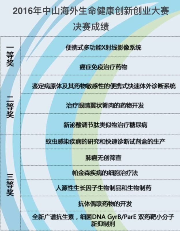 12月1日,2016年中山海外生命健康創(chuàng)新創(chuàng)業(yè)大賽決賽在中山電視臺演播廳舉行。中山市委常委、火炬開發(fā)區(qū)黨工委書記、翠亨新區(qū)黨工委書記侯奕斌,中山市副市長楊文龍,火炬開發(fā)區(qū)黨工委副書記林細(xì)權(quán),中國科技金融促進(jìn)會風(fēng)險投資專委會常務(wù)副秘書長林寧,中關(guān)村管委會生命健康產(chǎn)業(yè)領(lǐng)域主管黃佳琪,中山市商務(wù)局副局長謝力,中山市科技局副局長陳崇喜,翠亨新區(qū)黨工委委員、管委會總經(jīng)濟(jì)師梁兆華,國家健康基地總經(jīng)理方迎等領(lǐng)導(dǎo)現(xiàn)場“觀戰(zhàn)”。