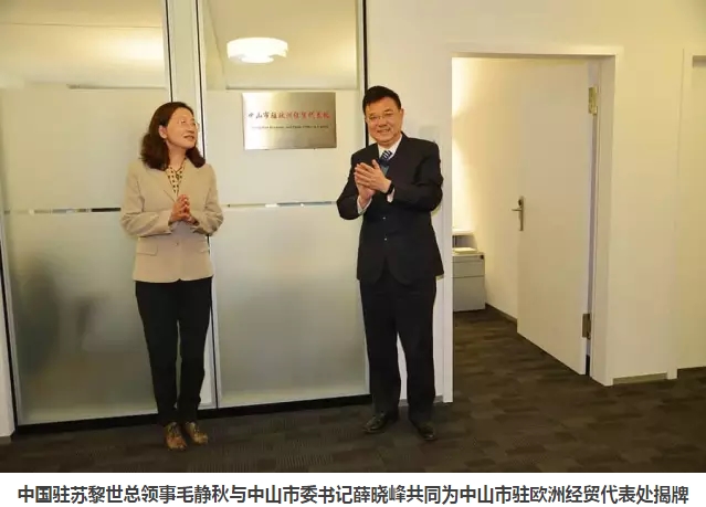瑞士時間11月18日,中山市駐歐洲經(jīng)貿(mào)代表處在蘇黎世揭牌成立,中山市委書記薛曉峰、中國駐蘇黎士總領事毛靜秋出席活動并共同揭牌。