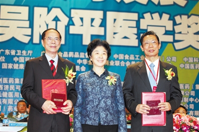 全國(guó)政協(xié)副主席王志珍向鐘南山、韓濟(jì)生兩位獲獎(jiǎng)?wù)哳C發(fā)了2011年吳階平醫(yī)學(xué)獎(jiǎng)獲獎(jiǎng)證書和獎(jiǎng)?wù)隆g娔仙绞俏覈?guó)著名的呼吸內(nèi)科專家、中國(guó)工程院院士,在我國(guó)抗SARS斗爭(zhēng)中取得了突出的醫(yī)學(xué)業(yè)績(jī),現(xiàn)任呼吸疾病國(guó)家重點(diǎn)實(shí)驗(yàn)室主任、廣東呼吸病研究所所長(zhǎng)、中華醫(yī)學(xué)會(huì)顧問。他在發(fā)表獲獎(jiǎng)感言時(shí)說,要解決目前日益緊張的醫(yī)患關(guān)系,奮戰(zhàn)在全國(guó)的醫(yī)衛(wèi)戰(zhàn)線的人員都應(yīng)向吳階平學(xué)習(xí)。韓濟(jì)生是神經(jīng)生理學(xué)家、中國(guó)科學(xué)院院士、國(guó)際知名疼痛學(xué)家、我國(guó)疼痛醫(yī)學(xué)的開創(chuàng)者,現(xiàn)任北京大學(xué)神經(jīng)科學(xué)研究所所長(zhǎng)、中華醫(yī)學(xué)會(huì)疼痛學(xué)分會(huì)主任委員、國(guó)際疼痛學(xué)會(huì)教育委員會(huì)國(guó)際顧問、國(guó)際疼痛學(xué)會(huì)中國(guó)分會(huì)主席。