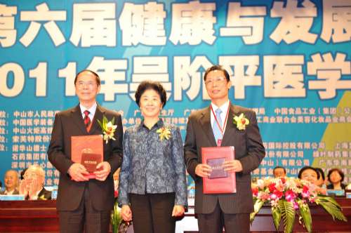 【大公報(bào)訊】中新社中山19日消息:中國(guó)醫(yī)學(xué)界最高規(guī)格的個(gè)人獎(jiǎng)項(xiàng)──吳階平醫(yī)學(xué)獎(jiǎng)今天在廣東中山市舉行頒獎(jiǎng)大會(huì),鍾南山院士、韓濟(jì)生院士獲得2011年吳階平醫(yī)學(xué)獎(jiǎng)。全國(guó)政協(xié)副主席、中科院院士、吳階平醫(yī)學(xué)獎(jiǎng)評(píng)委王志珍向兩位獲獎(jiǎng)?wù)哳C發(fā)了獲獎(jiǎng)證書和獎(jiǎng)?wù)隆?
